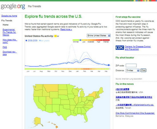 google.org/flutrends網站把流感症狀相關搜尋資料加以分析,並用「最低」、「低」「中」、「高」到「劇烈」等五個等級區分,以地圖及圖表標示美國各地流感活動的變化狀況,期能及早偵測流感正在蔓延的地區,幫助民眾防患未然。目前這項服務只限於美國,但Google希望這項技術最終能協助追蹤全世界的流感以及其他疾病。